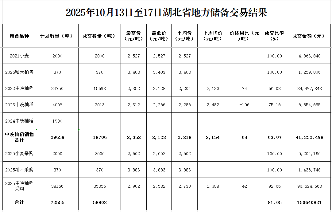 本周湖北地储成交各类粮油58802吨。其中销售:2021年小麦2000吨,成交率100%,成交均价2527元/吨;2025年籼米370吨,成交率100%,成交均价3403元/吨;2022年中晚籼稻15693吨,成交率66.08%,成交均价2204元/吨,环比上涨74元/吨;2023年中晚籼稻3013吨,成交率75.16%,成交均价2286/吨,环比下跌196元/吨。采购:2025年小麦2000吨,成交量100%,成交价格2602元/吨;2025年籼米370元/吨,成交率100%,成交均价3883元/吨;2025年中晚籼稻35356吨,成交率92.66%,成交均价2730/吨,环比上涨42/吨